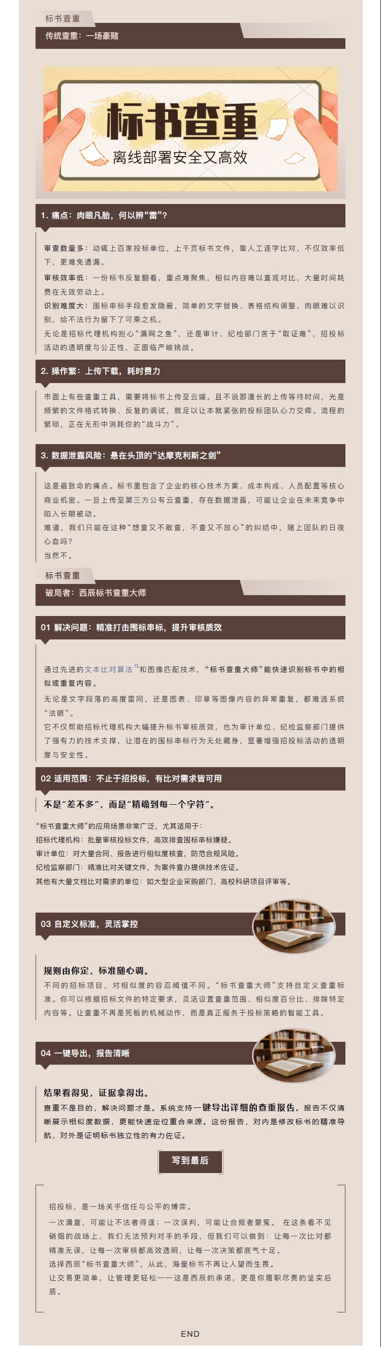 张经理是某招标代理公司的项目负责人,手上有三个项目的查重任务。每个项目都有几十家投标单位,标书摞起来比人还高。他和团队成员连续加班了一周,逐页翻看、逐段比对,眼睛都看花了,心里却还是没底——“这几家公司的技术方案怎么这么像?是巧合,还是……”他不敢往下想。一旦漏掉围标串标的蛛丝马迹,轻则项目废标重招,重则被监管部门问责。这种如履薄冰的感觉,是每一个招标代理人的日常。同样的情况,也困扰着审计单位和纪检监察部门。面对海量的合同、报告、投标文件,如何快速锁定异常、精准识别不正当竞争,成为摆在每个人面前的难题。传统的人工审查方式,早已捉襟见肘。