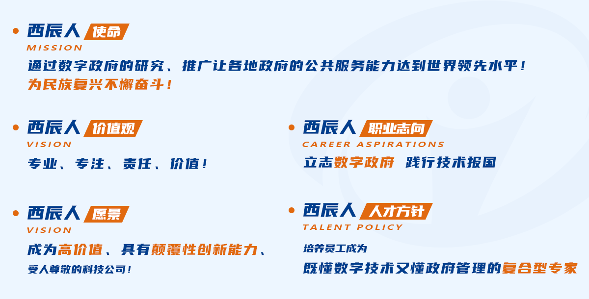 成都西辰软件有限公司成立于2007年,总部位于四川省成都市高新区,是行业领先的专注于数字政府领域,集业务咨询、方案规划、软硬件开发和集成服务的智慧政务综合体解决方案提供商。公司是以技术创新为主导的互联网“专精特新”高新技术中小企业,下辖5家独立运营的子公司,目前在职员工170余名,技术人员达120余名。主要业务涵盖“ 互联网+ 政务服务”、公共资源交易、互联网+督查督办、政府绩效管理、纪委大数据监察、智慧云办公、智慧政协、智慧人大等党政四大班子及大型国企事业单位,截止2022年底,西辰软件已与全国18个省市自治区,800余个省市区县党政机关、大型国企事业单位建立的长期合作关系。公司综合实力雄厚,企业信誉良好,拥有国家高新技术企业认定、ISO 9001质量管理体系认证、ISO 27001信息安全管理体系认证、AAA级企业信用认证等20余项专业资质,拥有智慧政务系列软件著作权证书220余项,发明专利1项,国产化安可认证47项,数十个客户案例荣获了各类荣誉资质。西辰软件秉持客户第一的理念,以“ 专业、专注、责任、价值”的企业文化为全国各政府行业客户提供优质的技术服务。我们将牢记使命、不忘初心,为推动中国公共服务能力和管理效率达到世界领先水平,助力民族复兴而不懈奋斗!