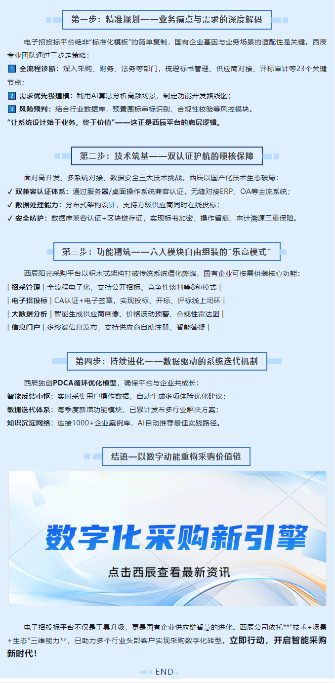在数字经济时代,国有企业招投标效率直接影响供应链竞争力。传统模式中,流程冗杂、数据孤岛、安全隐患等问题频现,如何构建安全、高效、可扩展的电子招投标平台?西辰公司以十余年行业积淀,推出阳光采购平台全链路解决方案,从规划到落地,四大核心策略助力国有企业实现招投标数字化转型!
